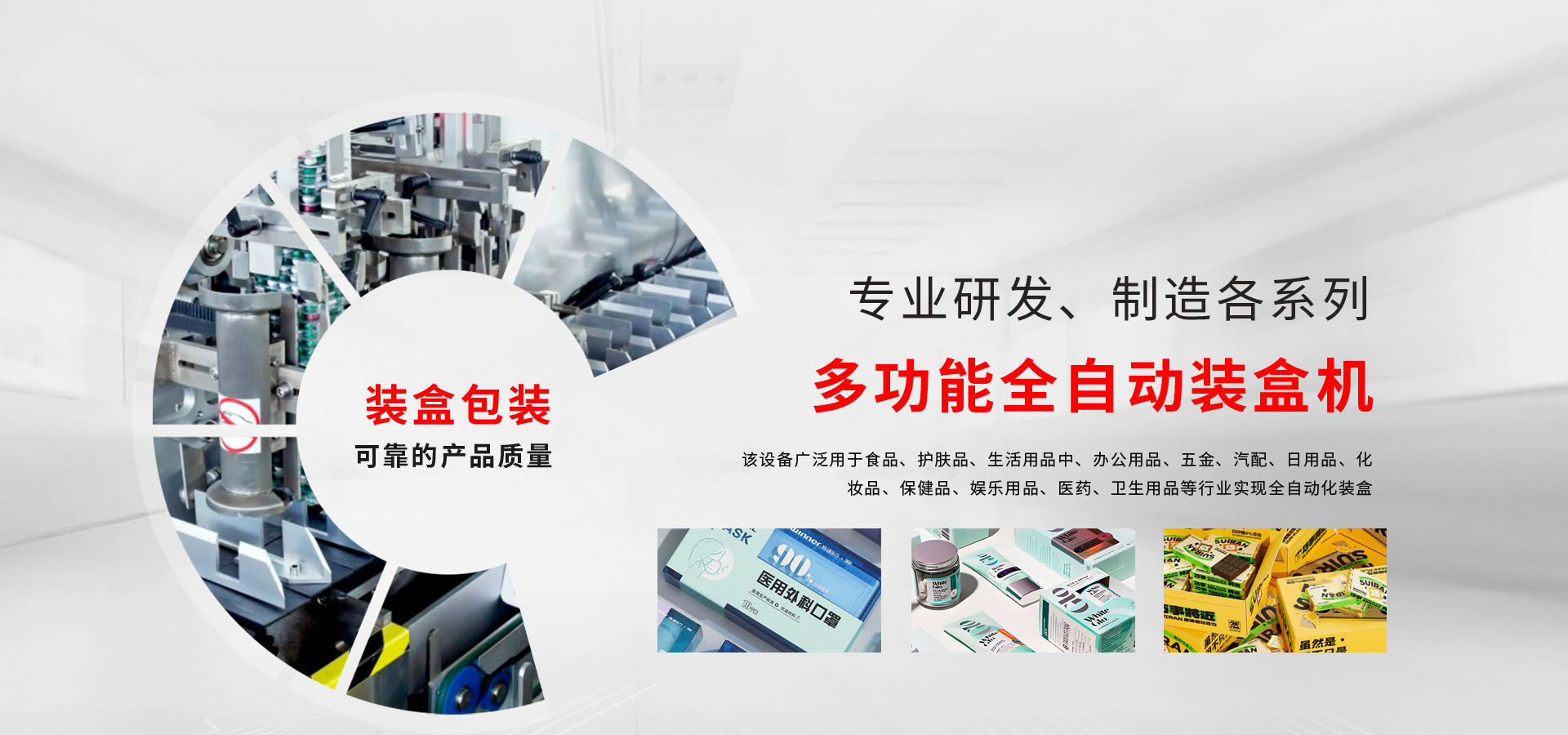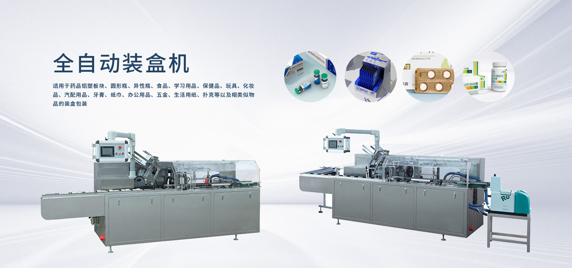 適用于藥品鋁塑板塊、圓形瓶、異性瓶、食品、學習用品、保健品、玩具、化妝品、汽配用品、牙膏、紙巾、辦公用品、五金、生活用紙、撲克等以及相類似物品的裝盒包裝。